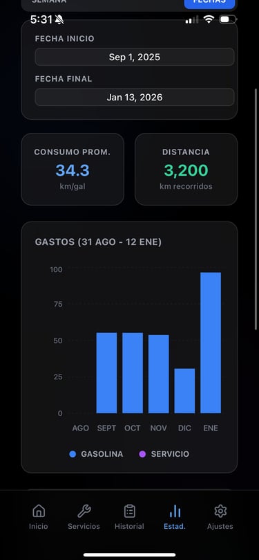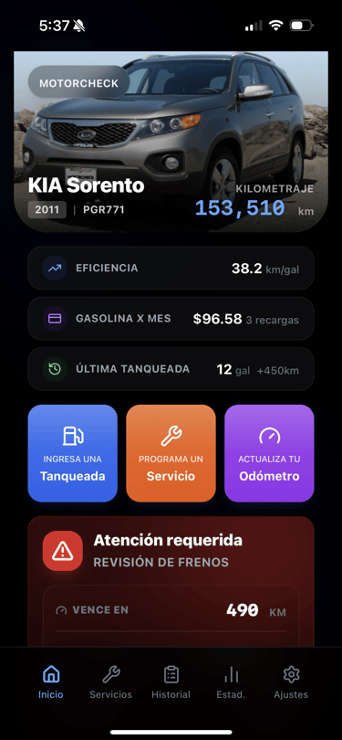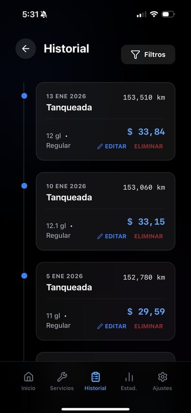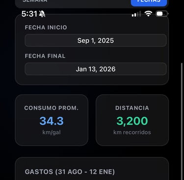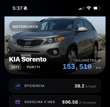 → Datos del vehículo, registros de combustible y mantenimiento, fotos opcionales.